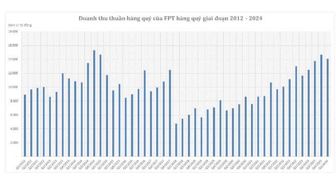 Dù “đắt” hay “rẻ” thì FPT giờ đây đã nổi lên như là cổ phiếu tích sản điển hình nhất, sau những “huyền thoại” như MWG hay VNM trước đây. Tính chất “điển hình” này không hẳn chỉ đến từ việc giá cổ phiếu giữ xu hướng đi lên trong thời gian rất dài bất chấp thị trường chung trải qua nhiều thăng trầm, mà còn đến từ sự bền bỉ tới đáng ngạc nhiên trong hoạt động kinh doanh.