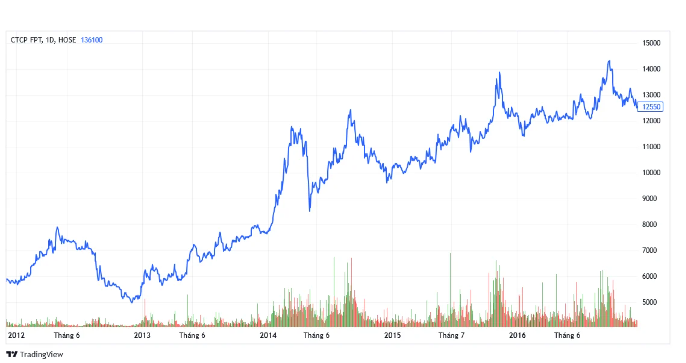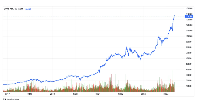 Sang đến giai đoạn 2017 – tháng 5/2023, thị giá FPT tăng từ khoảng 13.000 đồng/cổ phiếu lên khoảng 136.000 đồng/cổ phiếu, tương đương tốc độ tăng trưởng luỹ kế khoảng 37%/năm. Nôm na là sau chưa đầy 8 năm, nhà đầu tư nắm giữ trọn vẹn cổ phiếu FPT đã nhân 10 lần tài khoản.