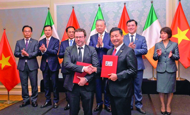 Tổng Bí thư, Chủ tịch nước Tô Lâm và nhiều lãnh đạo bộ, ngành chứng kiến lễ trao biên bản thỏa thuận hợp tác giữa ông Trương Gia Bình, Chủ tịch Tập đoàn FPT và Giáo sư Cathal Gurrin, Phó Trưởng khoa Khoa học máy tính, Giám đốc Trung tâm ADAPT, Đại học Thành phố Dublin, Ireland