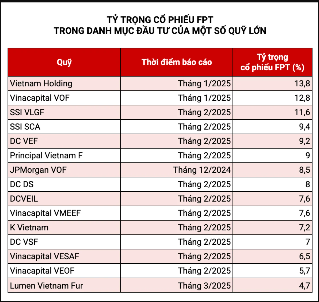 Áp lực bán ròng không chỉ khiến vốn hóa FPT lao dốc mà còn tác động mạnh đến hiệu suất của các "cá mập". Mã này hiện chiếm tỷ trọng tương đối lớn trong danh mục của nhiều quỹ đầu tư.