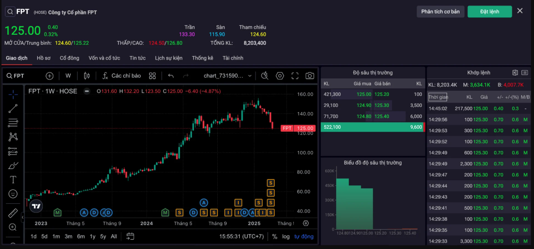 Kết thúc phiên giao dịch 20/3, cổ phiếu FPT của Công ty CP FPT ghi nhận mức hồi phục nhẹ, đóng cửa tại 125.300 đồng/cp. Tuy nhiên, so với vùng đỉnh 156.000 đồng/cp, mã này đã giảm hơn 20%.