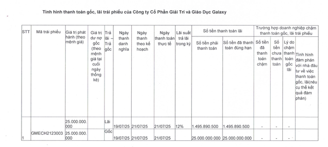 Cụ thể, ngày 19/7/2025, Galaxy EE đã thanh toán gần 1,5 tỷ đồng tiền lãi và 25 tỷ đồng tiền gốc lô GMECH2123003; qua đó tất toán xong lô trái phiếu này.
