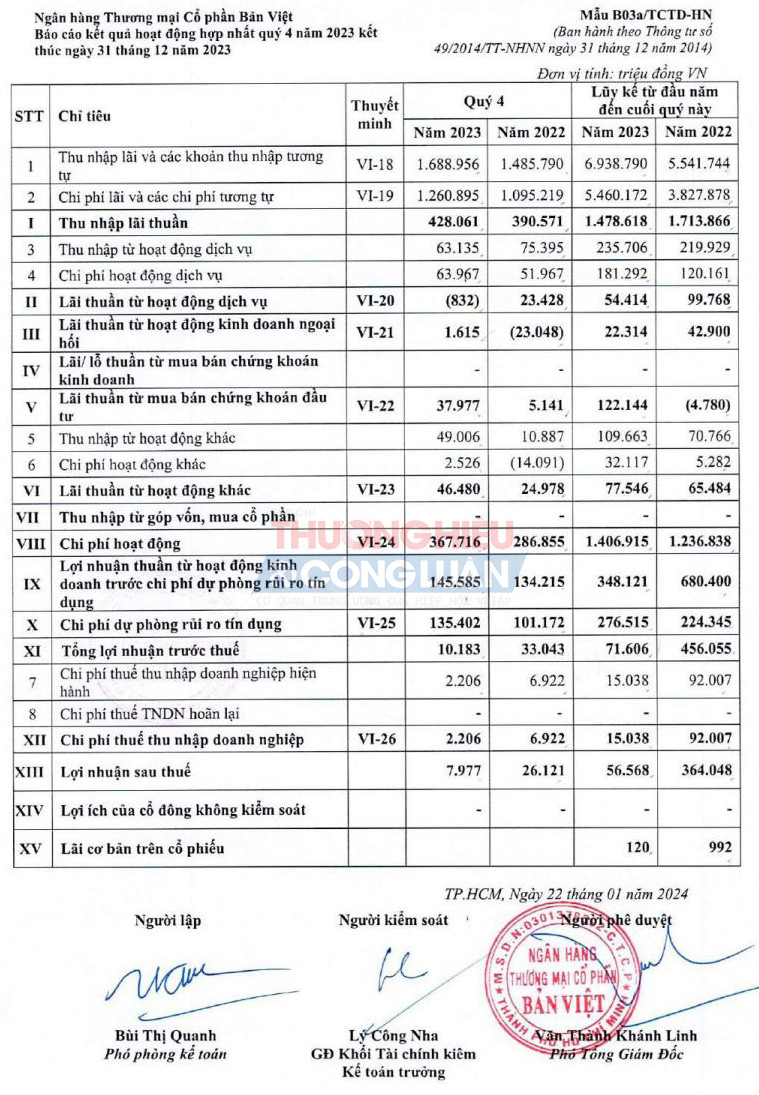 Theo báo cáo tài chính hợp nhất quý IV/2023 của Ngân hàng Thương mại cổ phần (TMCP) Bản Việt (BVBank) thì lợi nhuận sau thuế đạt 7,9 tỷ đồng giảm 18,1 tỷ đồng (tương đương giảm 69,4%) so với quý IV/2022, lũy kế từ đầu năm đến ngày 31/12/2023 đạt 56,5 tỷ đồng giảm 307, 4 tỷ đồng (tương đương giảm 84%) với với năm 2022.