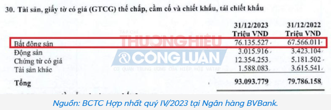 Theo đó, BCTC Hợp nhất quý IV/2023 (tính đến ngày 31/12/2023), ngân hàng BVBank đang nắm trong tay hơn 76.135,5 tỷ đồng bất động sản thế chấp, tăng 8.569,5 tỷ đồng so với thời điểm 31/12/2022, chiếm gần 82% tổng tài sản thế chấp. Tốc độ tăng này còn cao hơn cả tốc độ tăng trưởng tín dụng tại BVBank trong những năm trước đó.