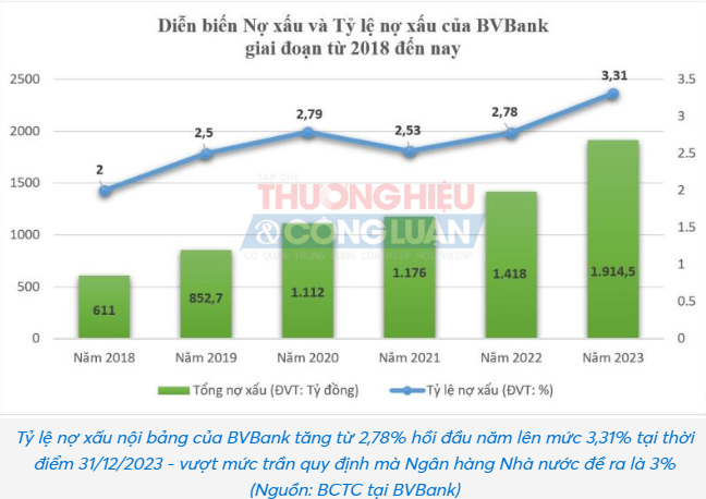 Như vậy, tổng nợ xấu nội bảng của BVBank đạt 1.914,5 tỷ đồng tăng 496 tỷ đồng so với quý IV/2022 là 1.418,5 tỷ đồng. Do đó, nhóm nợ xấu tại BVBank tăng 35% so với cùng kỳ năm ngoái. Tỷ lệ nợ xấu theo đó cũng tăng lên 3,31% vượt mức trần quy định mà Ngân hàng Nhà nước đề ra là 3%.