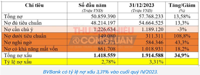 Tính đến ngày 31/12/2023, tổng tài sản của BVBank tăng 11,1% so với đầu năm, lên 87.883,9 tỷ đồng. Tổng cho vay khách hàng đạt 57.768 tỷ đồng, tăng 13,5% so với đầu năm; Dự phòng rủi ro cho vay tín dụng của nhà băng này vào thời điểm 31/12/2023 là -801 tỷ đồng, tăng 59,6 tỷ đồng so với cùng kỳ năm 2022.
