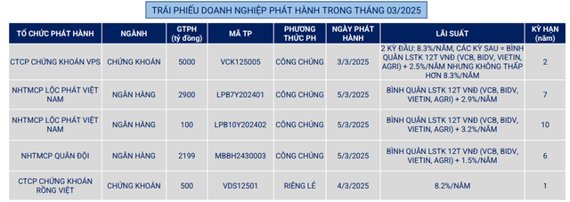 Theo dữ liệu được VBMA tổng hợp từ HNX và SSC, trong tháng 3/2025 có 5 đợt phát hành trái phiếu với tổng giá trị chào bán gần 10.700 tỷ đồng.