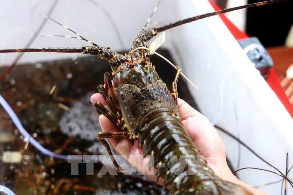 Tôm hùm nuôi ở thị xã Sông Cầu, tỉnh Phú Yên được gắn mã QRCode. Ảnh: Xuân Triệu - TTXVN