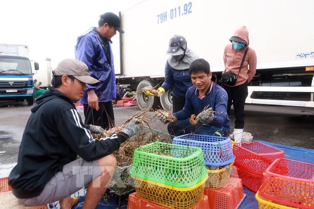 Người nuôi tôm hùm ở thị xã Sông Cầu tỉnh Phú Yên phân loại tôm để bán cho thương lái. Ảnh: Xuân Triệu - TTXVN