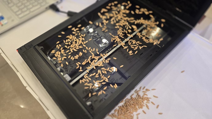 Mẫu lúa được đưa vào máy scan để chụp và chuyển hình ảnh sang AI phân tích. Ảnh: Trung Chánh