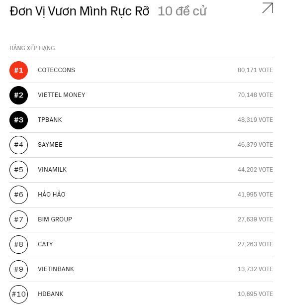 Nếu như giai đoạn đầu của cuộc bình chọn, Vinamilk áp đảo các doanh nghiệp còn lại với hàng chục nghìn lượt vote. Tuy nhiên, trong những ngày gần đây, Coteccons đã nhanh chóng bứt phá và để nắm giữ vị trí số 1 với hơn 80.000 lượt bình chọn kể từ ngày 20/1/2023 cho đến hôm nay - 23/1/2024.