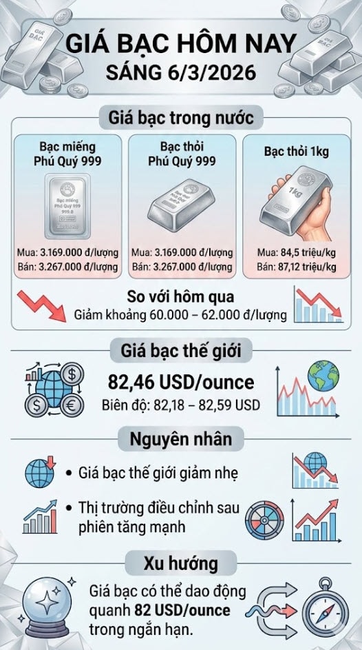 Giá bạc hôm nay 6/3 trong nước giảm nhẹ sau khi thị trường bạc thế giới điều chỉnh xuống quanh mốc 82 USD/ounce. Bạc Phú Quý 999 hiện giao dịch quanh 3,169 – 3,267 triệu đồng/lượng.