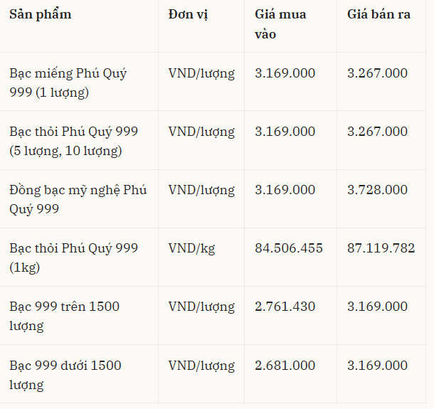 Hiện bạc miếng Phú Quý 999 được niêm yết quanh mức 3.169.000 đồng/lượng mua vào và 3.267.000 đồng/lượng bán ra.