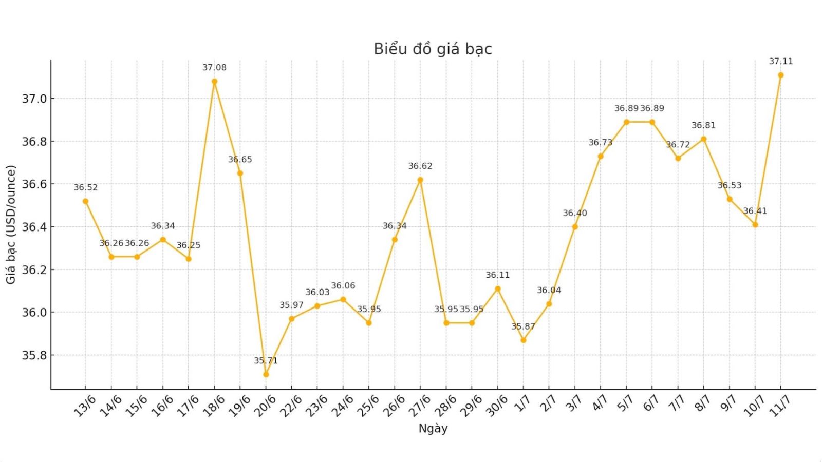 Tính đến 12h45 ngày 11.7 (theo giờ Việt Nam), giá bạc thế giới niêm yết ở ngưỡng 37,37 USD/ounce.