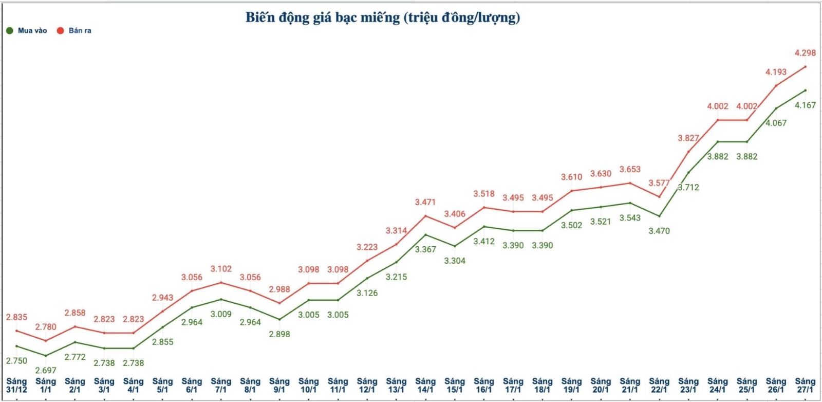 Tính đến 14h25 ngày 27.1, giá bạc miếng 2024 Ancarat 999 (1 lượng) tại Công ty Kim Loại Quý Ancarat niêm yết ở ngưỡng 4,166 - 4,268 triệu đồng/lượng (mua vào - bán ra); tăng 94.000 đồng/lượng chiều mua vào và tăng 96.000 đồng/lượng chiều bán ra so với sáng qua.