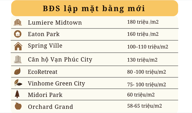 Khu vực phía Đông, Phường Bình Trưng với các dự án Lumiere Midtown, Eaton Park, Global City ghi nhận mức giá chung cư lên 160-180 triệu đồng/m2 và thấp tầng 400-450 triệu đồng/m2;