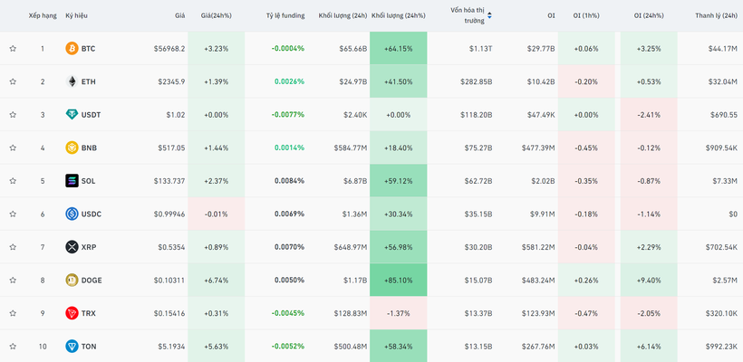 Theo dữ liệu của Coindesk, cập nhật tới 8h10 ngày 10/9 (theo giờ Việt Nam), giá Bitcoin giao dịch ở mức 57.015,80 USD/BTC, tăng 3,32% trong 24 giờ qua. Thanh khoản của đồng tiền mã hóa có giá trị vốn hóa lớn nhất thị trường ở mức 65,66 tỉ USD, tăng 64,15% so với ngày 9/9.