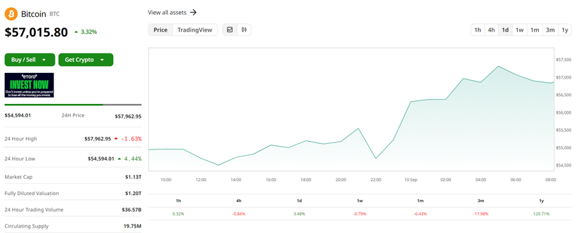 Giá Bitcoin giao dịch ở mức 57.015,80 USD/BTC, tăng 3,32% trong 24 giờ qua.