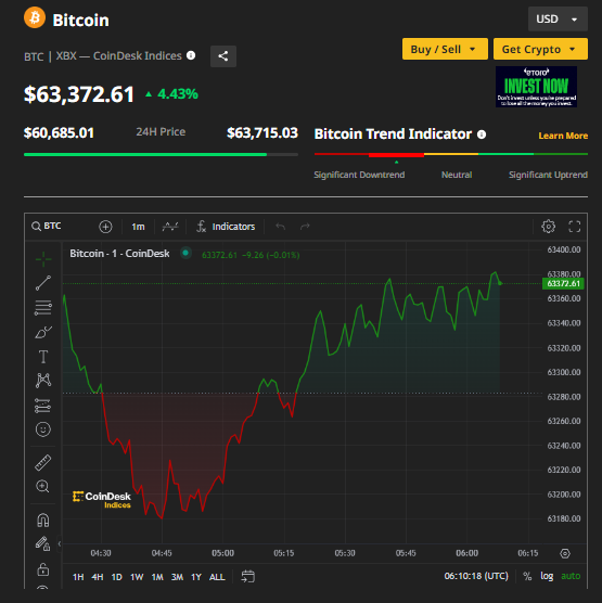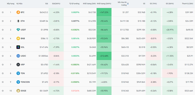 Giá Bitcoin giao dịch ở mức 63.372,61 USD/BTC, tăng 4,43% trong 24 giờ qua.