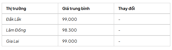 Giá cà phê neo ở mức 99.000 đồng/kg tại các vùng trồng trọng điểm.