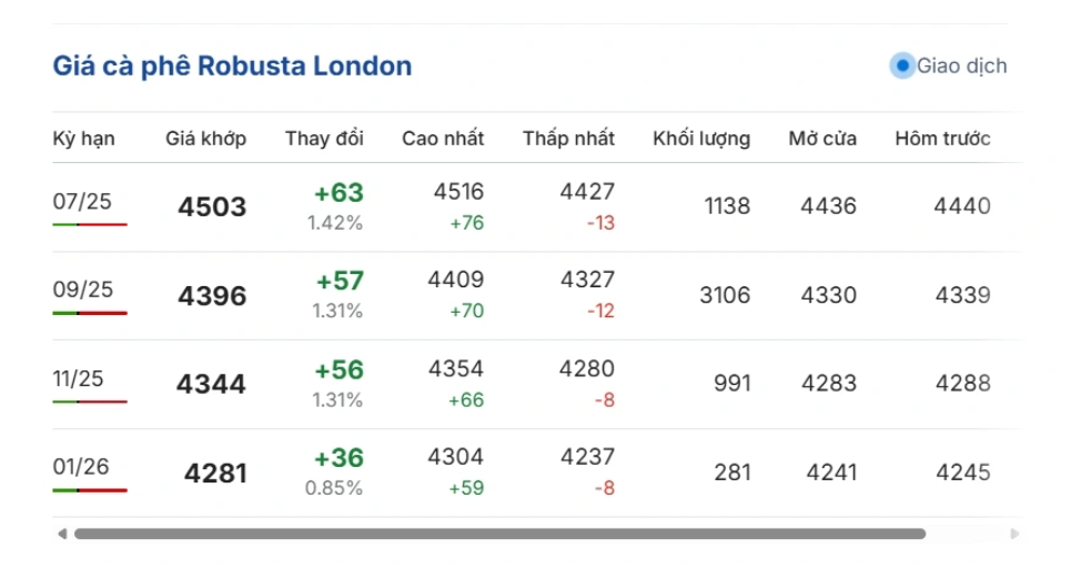 Trên sàn giao dịch London, giá cà phê Robusta đang dao động trong khoảng 4.427 - 4.516 USD/tấn. Cụ thể, giá cà phê Robusta hợp đồng kỳ hạn giao tháng 7/2025 trên sàn London giảm về mức 4.503 USD/tấn, tăng 1,42%, tương đương tăng 63 USD/tấn so với phiên cuối trước.