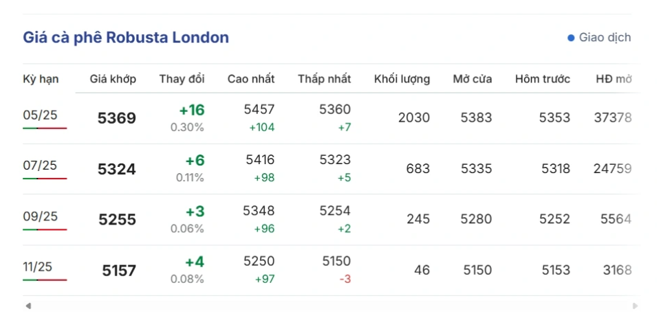 Trên sàn giao dịch London, giá cà phê Robusta đang dao động trong khoảng 5.360 - 5.457 USD/tấn. Cụ thể, giá cà phê Robusta hợp đồng kỳ hạn giao tháng 5/2025 trên sàn London tăng lên mức 5.363 USD/tấn, tăng 0,3%, tương đương giảm 16 USD/tấn so với phiên trước.