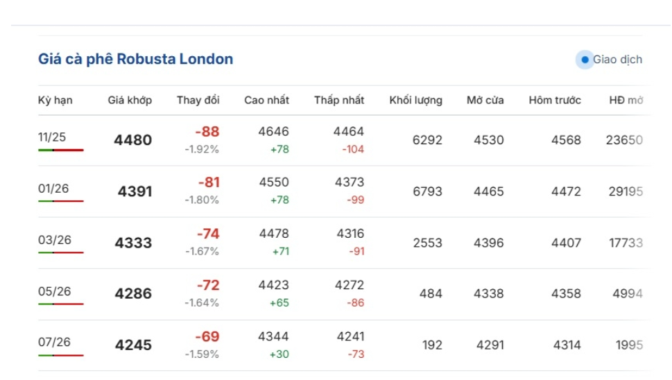 Cụ thể, trên sàn giao dịch London, giá cà phê Robusta đang dao động trong khoảng 4.464 - 4.646 USD/tấn. Giá cà phê Robusta hợp đồng kỳ hạn giao tháng 11/2025 trên sàn London đang ở mức 4.480 USD/tấn, giảm 1,92 % tương đương giảm 88 USD/tấn so với cuối phiên trước.