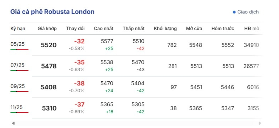Giá cà phê trên thị trường thế giới cuối ngày 12/3 (theo giờ Việt Nam) có xu hướng giảm; so với phiên giao dịch gần nhất, giá cà phê Robusta London dao động ở mức 5.404 – 5.577 USD/tấn. Cụ thể, giá cà phê Robusta hợp đồng kỳ hạn giao tháng 5/2025 trên sàn London giảm 0,58% so với phiên liền trước, tương đương 32 USD/tấn niêm yết ở mức 5.520 USD/tấn.