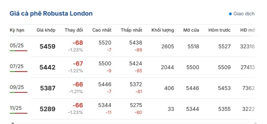 Giá cà phê hôm nay, giá cà phê thế giới quay đầu giảm ở cả hai sàn quốc tế London và New York. Cụ thể, giá cà phê Robusta hợp đồng kỳ hạn giao tháng 5/2025 trên sàn London giảm 1,23%, tương đương 68 USD/tấn, giao dịch ở mức 5.459 USD/tấn.