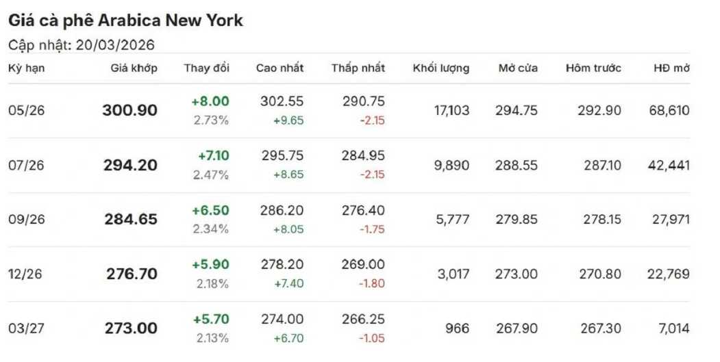 Tương tự, trên sàn New York, giá cà phê Arabica giao tháng 5 đi ngang, giữ ở mức khoảng 200,90 cent/lb.