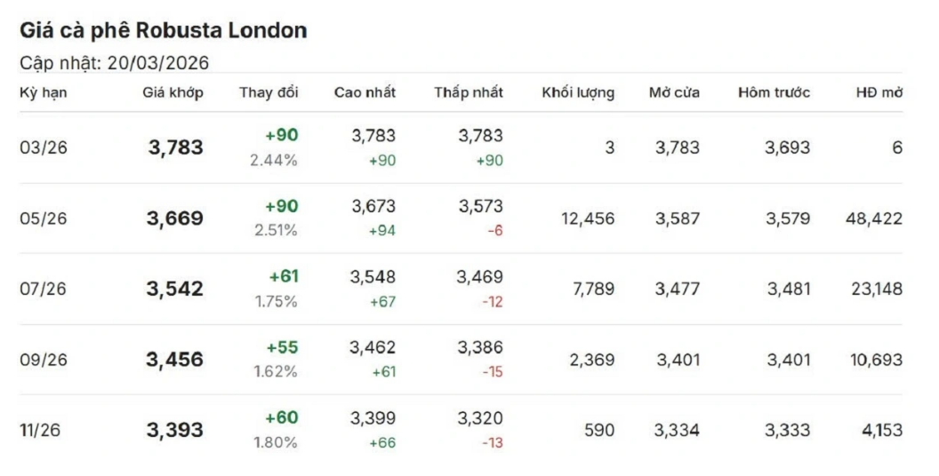 Chiều 21/3 (giờ Việt Nam), giá cà phê thế giới tiếp tục đi ngang, chưa xuất hiện biến động mới trên cả hai sàn giao dịch. Cụ thể, trên sàn London, giá cà phê Robusta kỳ hạn giao tháng 5/2026 giữ giá ổn định so với phiên liền trước, niêm yết quanh mức 3.783 USD/tấn.