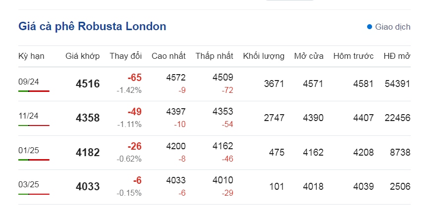 Giá cà phê thế giới vào lúc 21h tối 23/7 (theo giờ Việt Nam) đồng loạt giảm trên cả 2 sàn giao dịch quốc tế. So với phiên giao dịch gần nhất, giá cà phê Robusta London dao động ở mức 4.509 – 4.572 USD/tấn. Cụ thể, giá cà phê Robusta hợp đồng kỳ hạn giao tháng 9/2024 trên sàn London giảm 1,42%, tương đương 65 USD/tấn, giao dịch ở mức 4.516 USD/tấn.