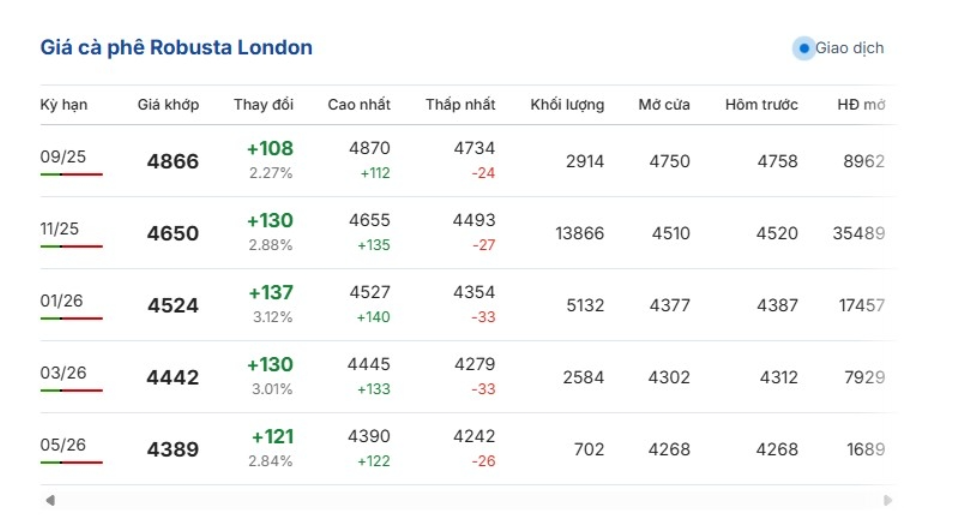 Giá cà phê trên thị trường thế giới cuối ngày 23/8 (theo giờ Việt Nam) đồng loạt tăng; so với phiên giao dịch gần nhất, giá cà phê Robusta London dao động ở mức 4.242 – 4.870 USD/tấn. Cụ thể, giá cà phê Robusta hợp đồng kỳ hạn giao tháng 9/2025 trên sàn London tăng 2,27%, tương đương 108 USD/tấn, giao dịch ở mức 4.866 USD/tấn.