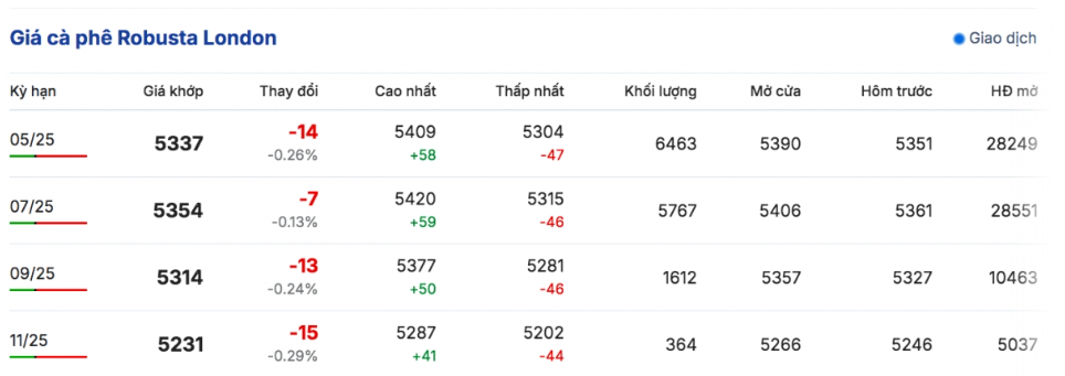 Giá cà phê trên thị trường thế giới tối ngày 29/3 (theo giờ Việt Nam); so với phiên giao dịch gần nhất, giá cà phê Robusta London dao động ở mức 5.304 – 5.409 USD/tấn. Cụ thể, giá cà phê Robusta hợp đồng kỳ hạn giao tháng 5/2025 trên sàn London giảm 0,26%, tương đương 14 USD/tấn, giao dịch ở mức 5.337 USD/tấn.