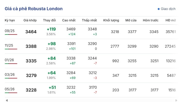 Giá cà phê hôm nay, giá cà phê thế giới trên cả hai sàn London và New York đồng loạt tăng. Cụ thể, giá cà phê Robusta hợp đồng kỳ hạn giao tháng 9/2025 trên sàn London tăng 3,56% tương đương 119 USD/tấn, niêm yết ở mức 3.464 USD/tấn.