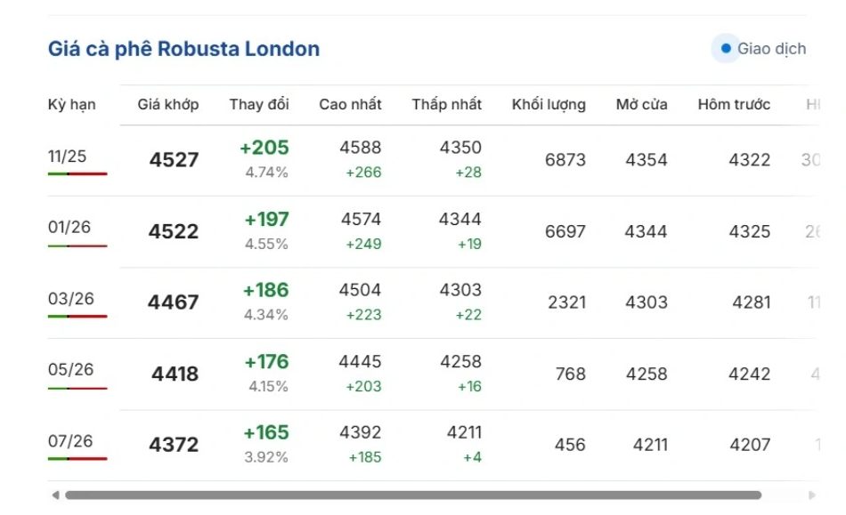 Giá cà phê tại thị trường thế giới tối 5/10 (theo giờ Việt Nam), giá cà phê đồng loạt tăng; so với phiên giao dịch gần nhất, giá cà phê Robusta London dao động ở mức 4.350 – 4.588 USD/tấn. Cụ thể, giá cà phê Robusta hợp đồng kỳ hạn giao tháng 11/2025 trên sàn London tăng 4,74%, tương đương 205 USD/tấn, giao dịch ở mức 4.527 USD/tấn.