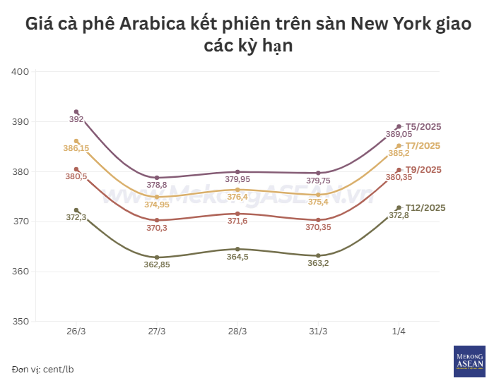 Cà phê Arabica giao kỳ hạn tháng 9/2025 tăng 2,7% so với tham chiếu, lên 380,35 cent/lb; kỳ hạn tháng 12/2025 tăng 2,64%, đạt 372,8 cent/lb.