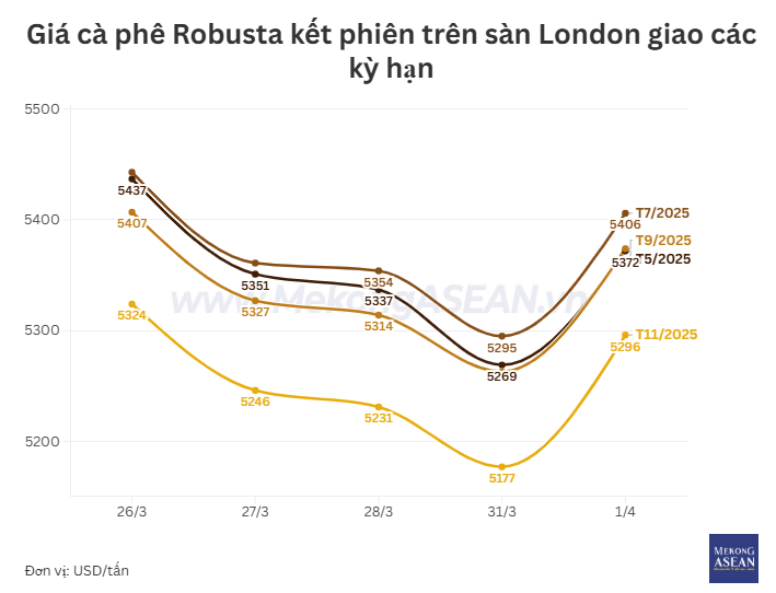 Giá cà phê Robusta trên sàn London ghi nhận tăng mạnh ở cả 4 kỳ hạn giao. Cụ thể, giá cà phê giao kỳ hạn tháng 5/2025 tăng 1,95% so với tham chiếu, lên 5.372 USD/tấn; giao kỳ hạn tháng 7/2025 cũng tăng 2,1%, đạt 5.406 USD/tấn. Cà phê Robusta giao kỳ hạn tháng 9/2025 lên 5.374 USD/tấn, tương ứng tăng 2,11%; tháng 11/2025 đạt 5.296 USD/tấn, tăng 2,3%.