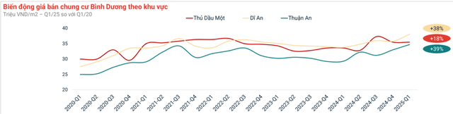 Dữ liệu mới nhất của Batdongsan.com.vn chỉ ra, trong vòng 10 năm qua, giá rao bán trung bình các căn hộ tại Bình Dương đã tăng khoảng 112%. Quý 1/2025 giá chung cư tại Thuận An đã tăng khoảng 39% so với Quý 1/2020. Sự biến động tăng giá thể hiện rõ nét nhất ở các dự án có vị trí giáp ranh TP.Thủ Đức (TP.HCM).