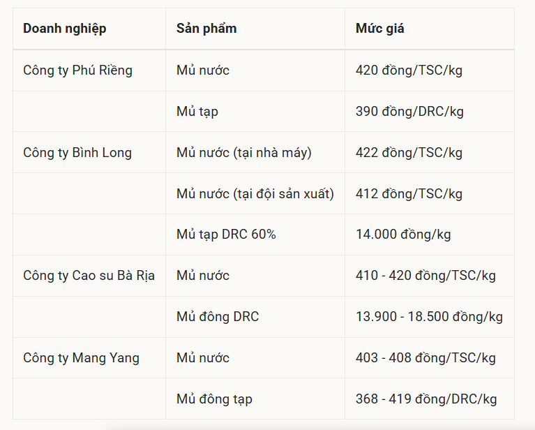 Trái với diễn biến sôi động của thế giới, thị trường cao su trong nước ngày 23/11 không ghi nhận biến động mới, các doanh nghiệp giữ nguyên mức giá thu mua ổn định. Sự ổn định này cho thấy nguồn cung nội địa đang ở mức cân bằng và không chịu nhiều tác động từ các xu hướng giá trên sàn quốc tế.