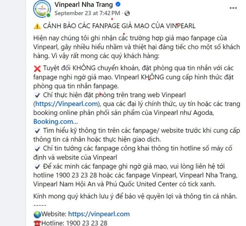 Vinpearl Nha Trang đăng cảnh báo về việc các web mạo danh.