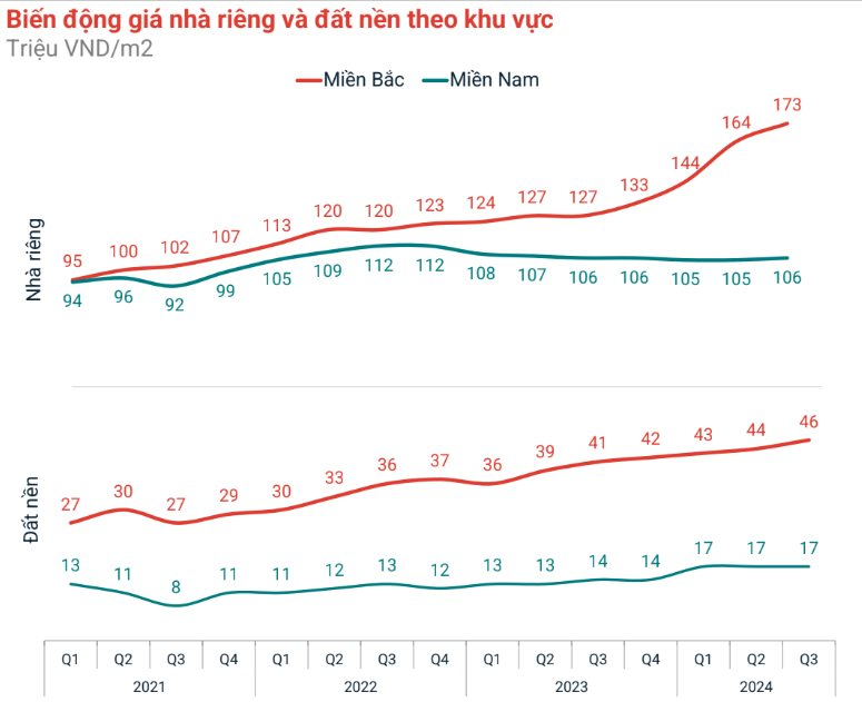 Nhìn vào lịch sử giá đất tại miền Bắc, giá đất nền trung bình tại khu vực này hồi quý 1/2021 là 27 triệu đồng/m2, tới quý 3/2024 đã tăng lên 46 triệu đồng. Trong khi đó tại miền Nam cùng khoảng thời gian, giá đất nền chỉ tăng nhẹ từ 13 triệu đồng/m2 lên 17 triệu.