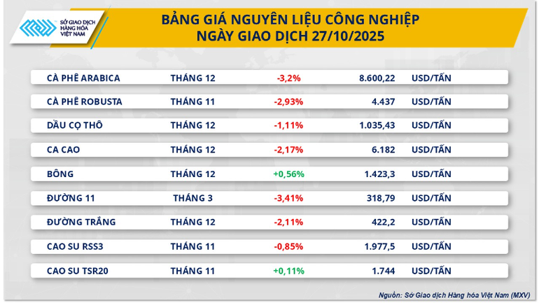Kết thúc phiên giao dịch hôm qua, theo ghi nhận của Sở Giao dịch Hàng hóa Việt Nam (MXV), nhóm nguyên liệu công nghiệp gây chú ý cho các nhà đầu tư trong nước và quốc tế khi dẫn dắt đà suy yếu. Trong đó, giá hai mặt hàng đường tiếp tục mở rộng đà suy yếu xuống mức thấp nhất trong vòng hơn 4 năm trở lại đây. Cụ thể, giá đường thô 11 giảm hơn 3,4%, còn 318,7 USD mỗi tấn; trong khi đường trắng cũng đánh mất hơn 2,1%, xuống 422 USD/tấn.