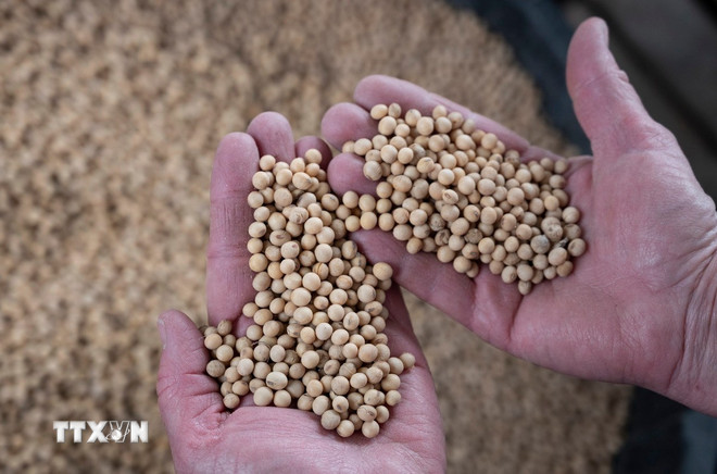 Nông dân thu hoạch đậu tương tại trang trại ở Scribber, bang Nebraska, Mỹ. (Ảnh: AFP/ TTXVN)