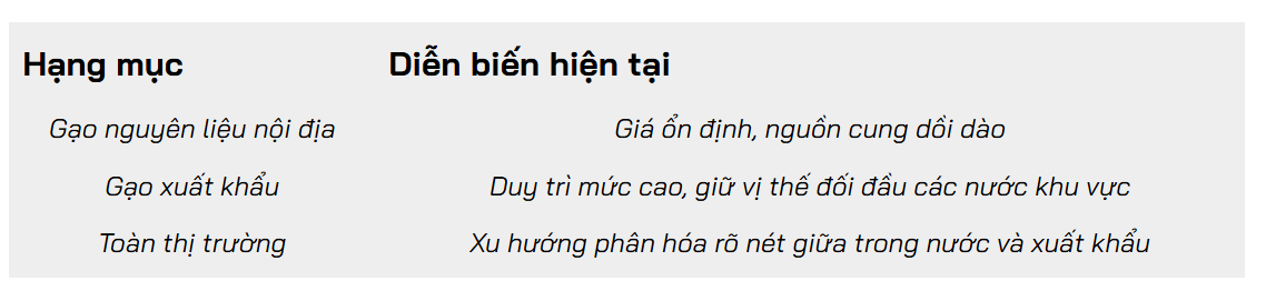 Các phân khúc như gạo 25% tấm (~367 USD/tấn) và 100% tấm (~333–337 USD/tấn) duy trì ổn định.