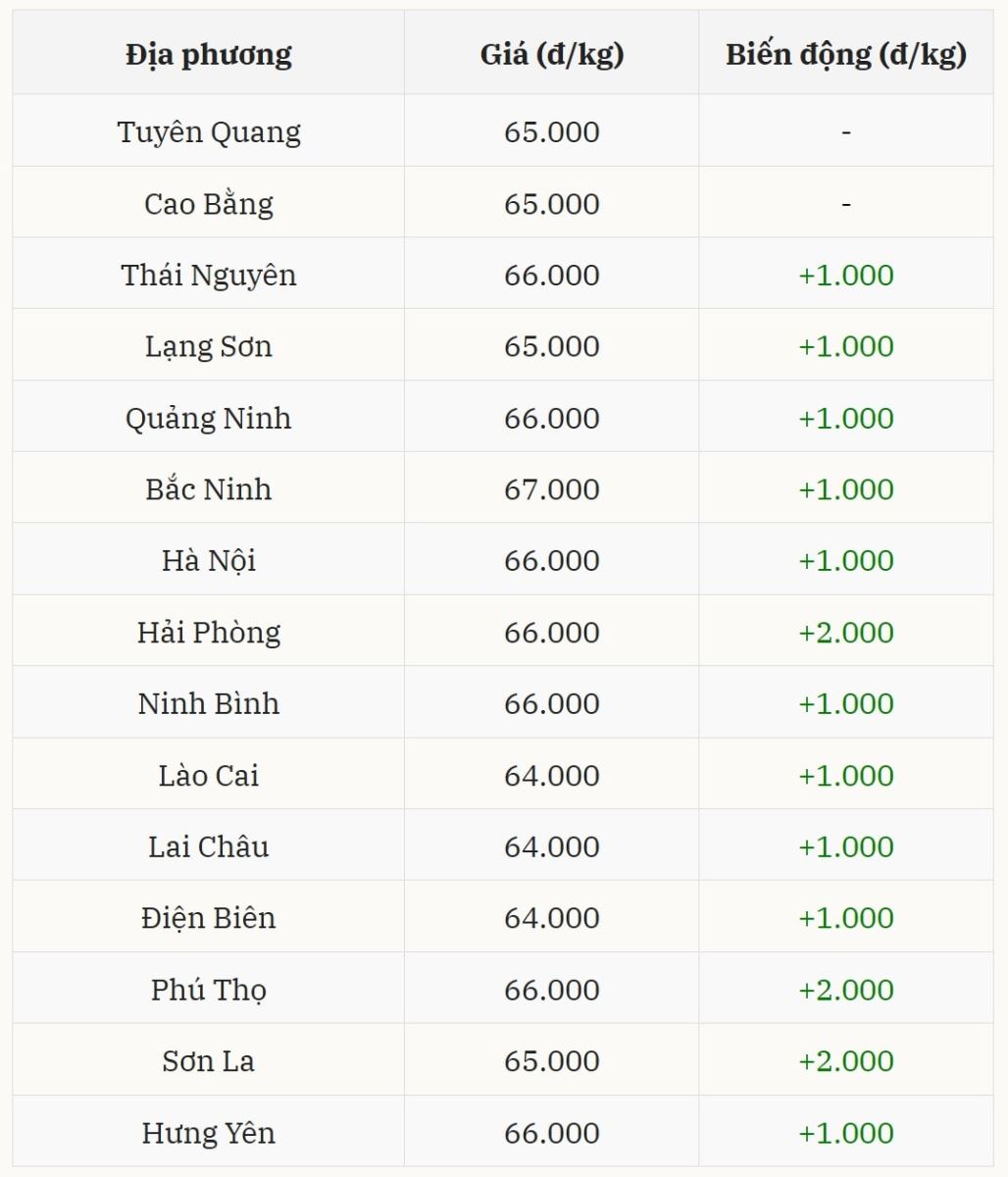 Nhóm địa phương tăng 1.000 đồng mỗi kg khá rộng, gồm Bắc Ninh lên 67.000 đồng mỗi kg, mức cao nhất toàn vùng. Thái Nguyên, Quảng Ninh, Hà Nội, Ninh Bình và Hưng Yên đồng loạt đạt 66.000 đồng mỗi kg. Lạng Sơn đứng ở mức 65.000 đồng mỗi kg, còn Lào Cai, Lai Châu và Điện Biên cùng neo tại 64.000 đồng mỗi kg.