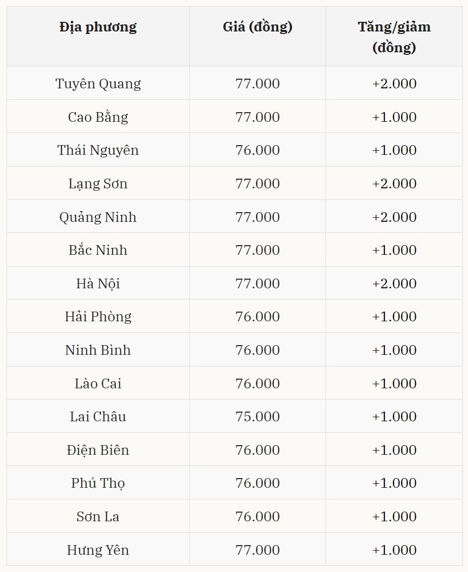 Các tỉnh Thái Nguyên, Hải Phòng, Ninh Bình, Lào Cai, Điện Biên, Phú Thọ và Sơn La đồng loạt điều chỉnh tăng 1.000 đồng/kg, lên mức 76.000 đồng/kg. Riêng Lai Châu vẫn là địa phương có giá thấp nhất khu vực, đạt 75.000 đồng/kg sau khi tăng nhẹ.