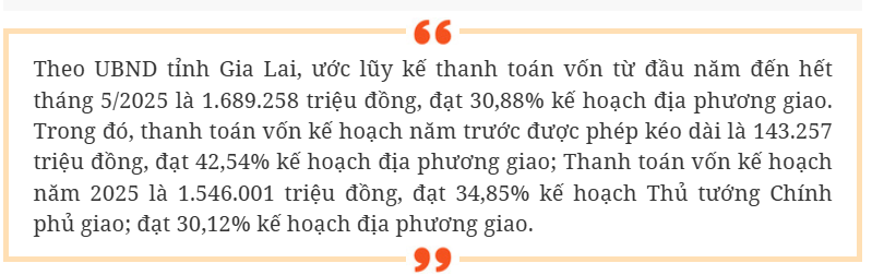 Gia Lai dự kiến hết tháng 5/2025 giải ngân vốn đầu tư công đạt trên 30% kế hoạch được giao. Lãnh đạo tỉnh này cũng nhận định, các nguyên nhân ảnh hưởng đến tiến độ giải ngân thời gian qua là do thiếu vật liệu, vướng mặt bằng.