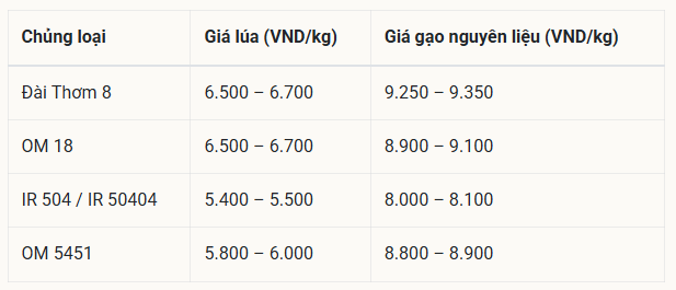 Trong khi giá lúa đi ngang, mặt bằng giá gạo nguyên liệu ghi nhận sự điều chỉnh nhẹ ở một số chủng loại nhất định. Gạo Đài Thơm 8 nhích thêm khoảng 50 đồng/kg, đạt mức 9.250 – 9.350 đồng/kg. Ngược lại, các loại gạo khác cơ bản giữ biên độ ổn định như IR 504 đạt 8.000 – 8.100 đồng/kg và OM 5451 khoảng 8.800 – 8.900 đồng/kg.
