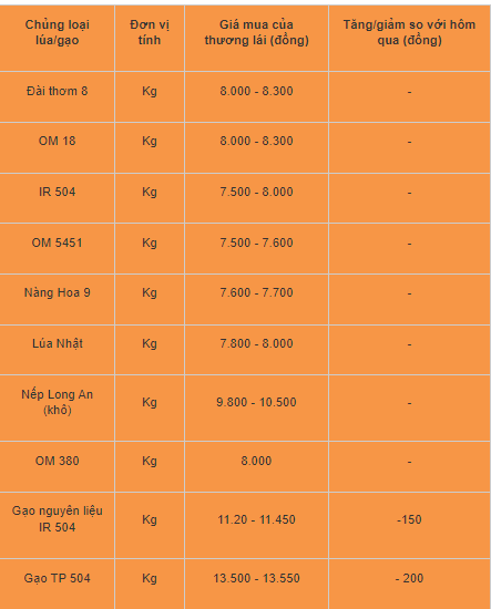 Nàng Hoa 9 ở mức 7.600 - 7.700 đồng/kg; Lúa Nhật giá 7.800 - 8.000 đồng/kg; giá Nếp Long An dao động quanh mức 9.800 - 10.500 đồng/kg; Nàng Nhen khô 20.000 đồng/kg.